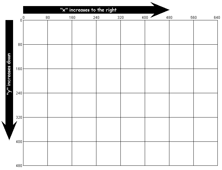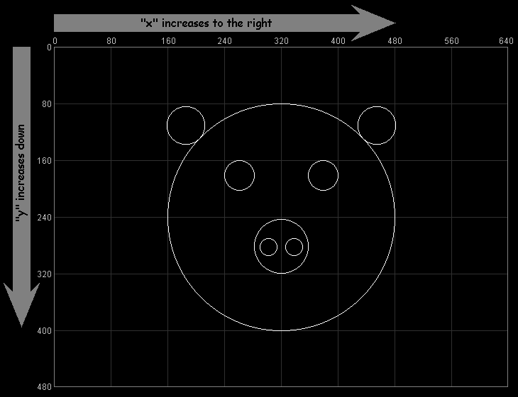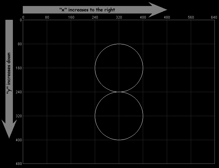 As you might have guessed, the second number controls the vertical position of the circle. We call this the "y" position, but note that larger "y" values move the circle down (not up). This is the reverse of the normal mathematical convention, but you can remember both the "x" and "y" conventions by remembering that they progress in the same direction as normal English writing. We write on a page from left to right ("x" direction) and from the top down ("y" direction). Both of these are summarized in the following diagram: